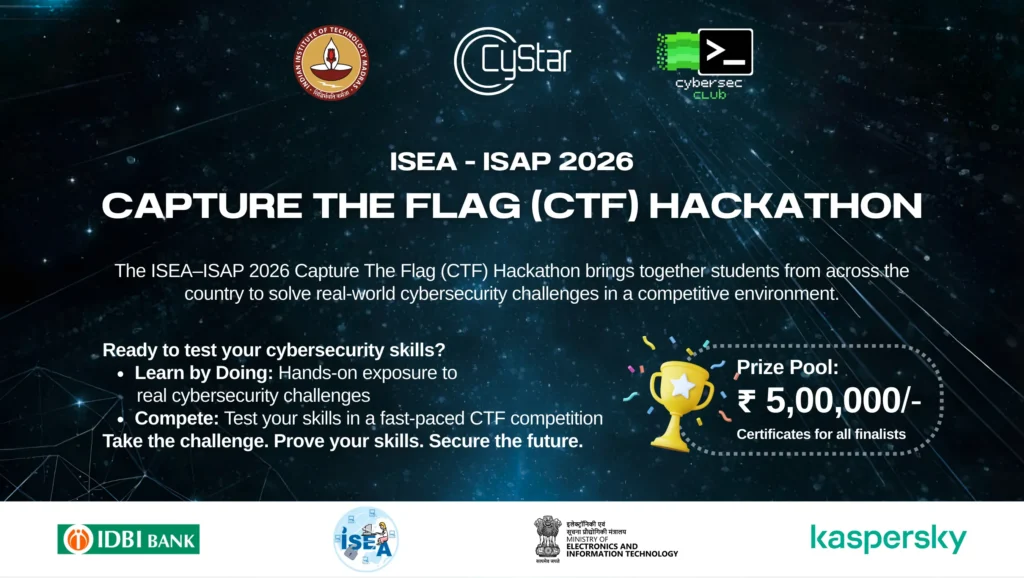ISEA ISAP CTF 2026 is a national-level Capture-the-Flag (CTF) hackathon organized by IIT Madras, in collaboration with the Cybersecurity Club, IIT Madras, as part of the 5th ISEA International Conference on Security and Privacy (ISAP) 2026.